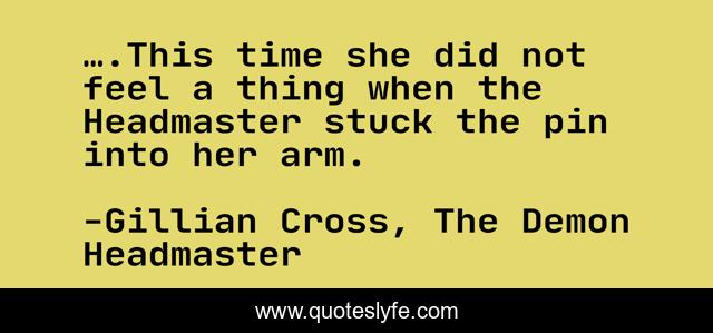 This page presents the quote "….This time she did not feel a thing when the Headmaster stuck the pin into her arm.". Author of this quote is Gillian Cross, The Demon Headmaster. This quote is about evil, hypnotism,.