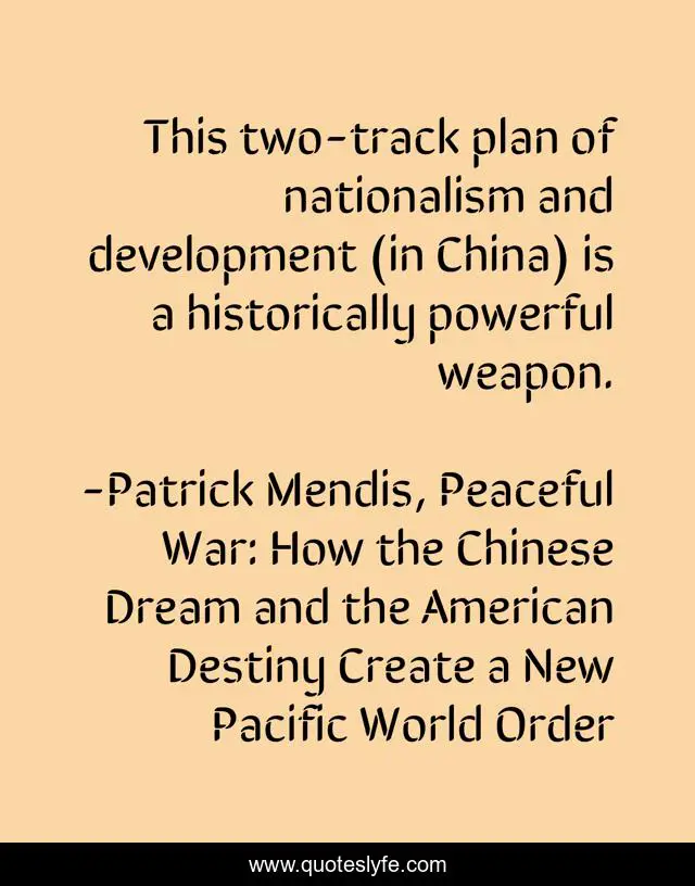 This page presents the quote "This two-track plan of nationalism and development (in China) is a historically powerful weapon.". Author of this quote is Patrick Mendis, Peaceful War: How the Chinese Dream and the American Destiny Create a New Pacific World Order. This quote is about development, china, nationalism, powerful-weapon,.