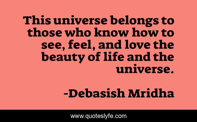 This page presents the quote "This universe belongs to those who know how to see, feel, and love the beauty of life and the universe.". Author of this quote is Debasish Mridha. This quote is about love-the-universe, love, universe, philosophy, debasish-mridha, quotes, inspirational, enthusiasm, beauty-of-life,.