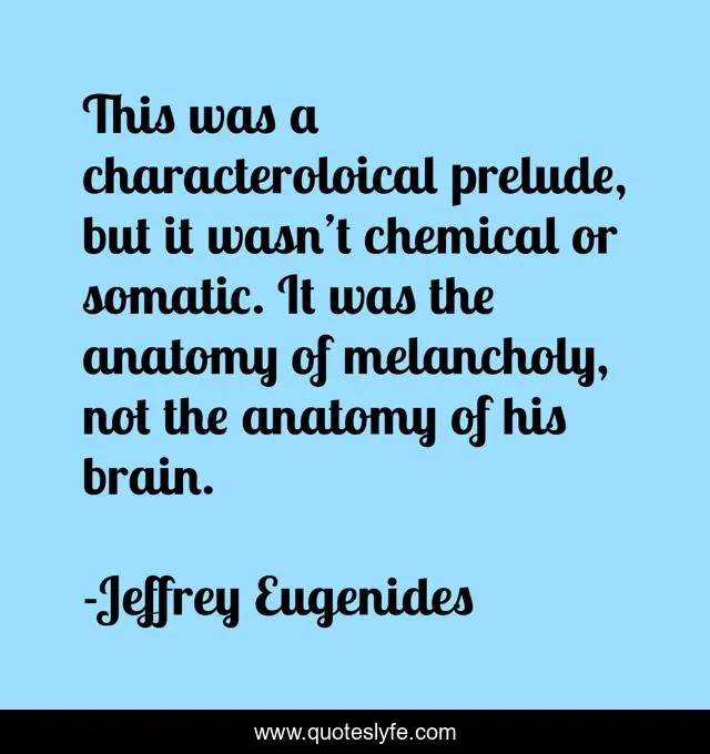 This page presents the quote "This was a characteroloical prelude, but it wasn’t chemical or somatic. It was the anatomy of melancholy, not the anatomy of his brain.". Author of this quote is Jeffrey Eugenides. This quote is about melancholy, brain, somatic, chemical, marriage-plot, mental-health, mental-illness,.