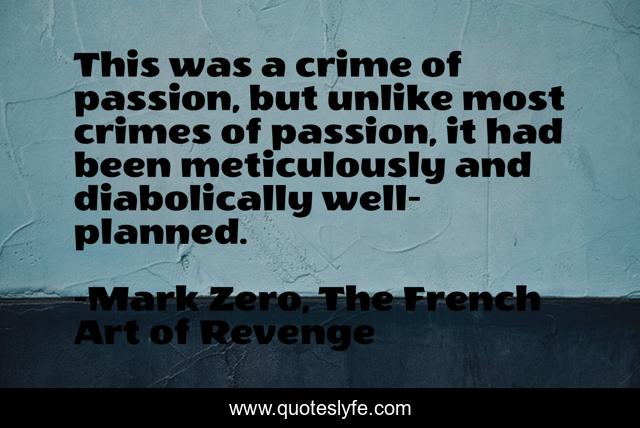 This page presents the quote "This was a crime of passion, but unlike most crimes of passion, it had been meticulously and diabolically well-planned.". Author of this quote is Mark Zero, The French Art of Revenge. This quote is about novel, crime, france, literature, fiction, francophiles,.