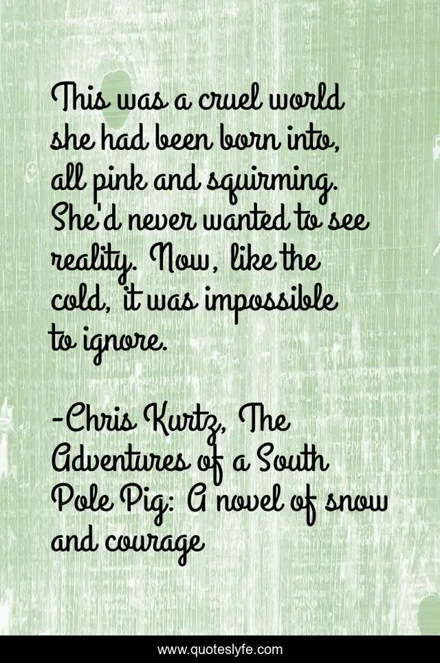 This page presents the quote "This was a cruel world she had been born into, all pink and squirming. She'd never wanted to see reality. Now, like the cold, it was impossible to ignore.". Author of this quote is Chris Kurtz, The Adventures of a South Pole Pig: A novel of snow and courage. .