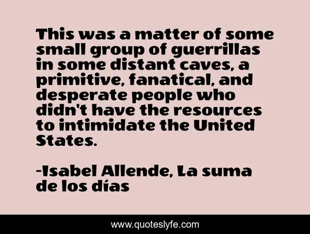 This page presents the quote "This was a matter of some small group of guerrillas in some distant caves, a primitive, fanatical, and desperate people who didn't have the resources to intimidate the United States.". Author of this quote is Isabel Allende, La suma de los días. This quote is about war-on-terror, war,.