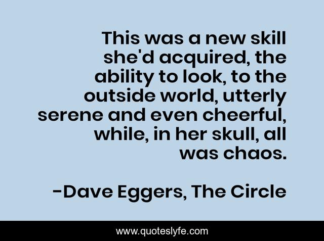 This page presents the quote "This was a new skill she'd acquired, the ability to look, to the outside world, utterly serene and even cheerful, while, in her skull, all was chaos.". Author of this quote is Dave Eggers, The Circle. This quote is about faking-happiness, faking-normal, deception, faking-being-happy, pretend, mind, chaos, pretend-happiness, deceit,.