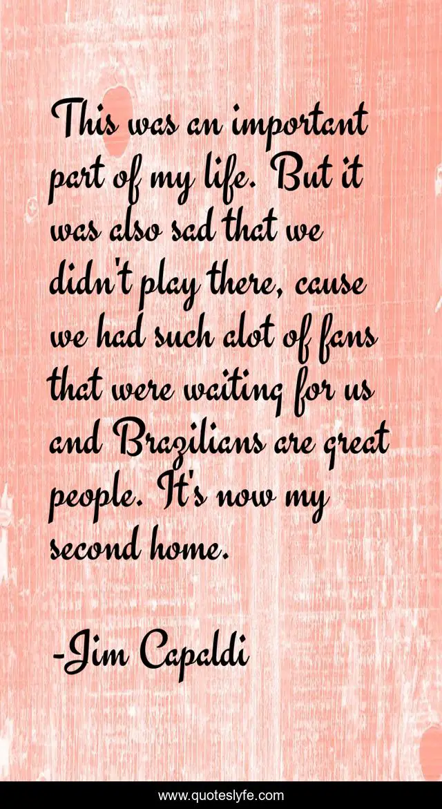 This page presents the quote "This was an important part of my life. But it was also sad that we didn't play there, cause we had such alot of fans that were waiting for us and Brazilians are great people. It's now my second home.". Author of this quote is Jim Capaldi. This quote is about home, life, great,.