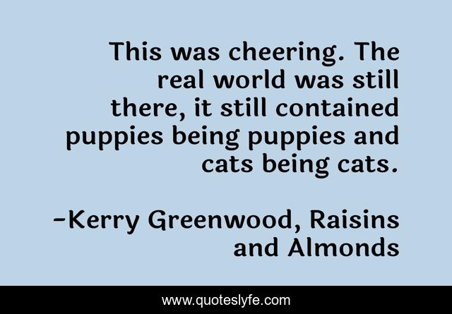 This page presents the quote "This was cheering. The real world was still there, it still contained puppies being puppies and cats being cats.". Author of this quote is Kerry Greenwood, Raisins and Almonds. This quote is about cheering, cats, puppies,.
