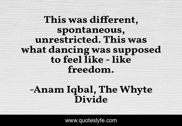 This page presents the quote "This was different, spontaneous, unrestricted. This was what dancing was supposed to feel like - like freedom.". Author of this quote is Anam Iqbal, The Whyte Divide. This quote is about romance, gangster-love-story, thriller, crime,.