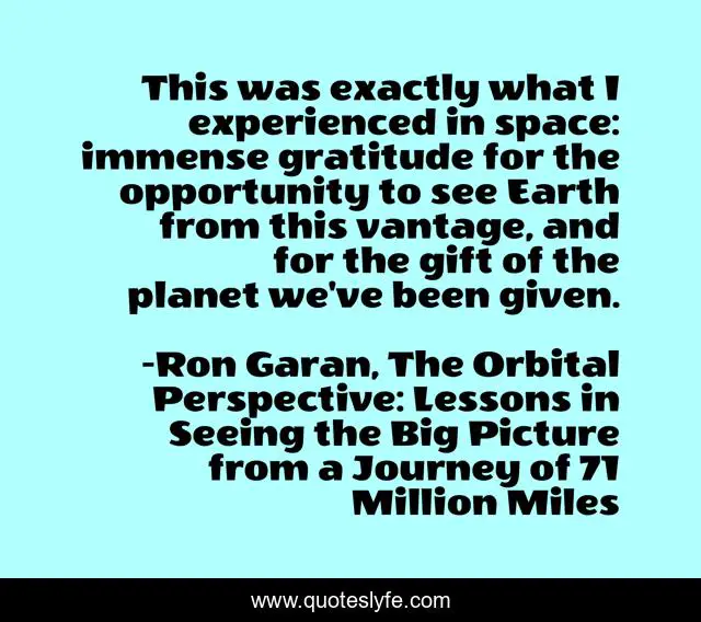 "Ron Garan, The Orbital Perspective: Lessons in Seeing the Big Picture from a Journey of 71 Million Miles Quotes." Quoteslyfe.com, 2025. Sat. 06 Dec. 2025. <https://www.quoteslyfe.com/quote/This-was-exactly-what-I-experienced-in-169845>.