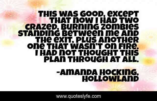 This page presents the quote "This was good, except that now I had two crazed, burning zombies standing between me and the exit, plus another one that wasn’t on fire. I had not thought this plan through at all.". Author of this quote is Amanda Hocking, Hollowland. .