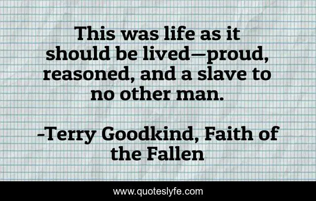 This page presents the quote "This was life as it should be lived—proud, reasoned, and a slave to no other man.". Author of this quote is Terry Goodkind, Faith of the Fallen. This quote is about 2000, life-and-living,.