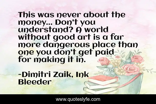 This page presents the quote "This was never about the money... Don't you understand? A world without good art is a far more dangerous place than one you don't get paid for making it in.". Author of this quote is Dimitri Zaik, Ink Bleeder. This quote is about money, creation, art,.