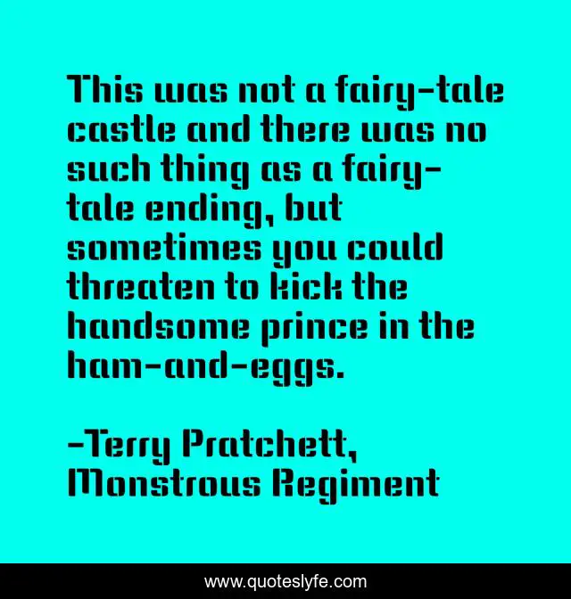 This page presents the quote "This was not a fairy-tale castle and there was no such thing as a fairy-tale ending, but sometimes you could threaten to kick the handsome prince in the ham-and-eggs.". Author of this quote is Terry Pratchett, Monstrous Regiment. This quote is about happy-end, humor, fairy-tale,.