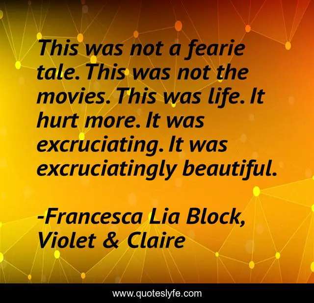 This page presents the quote "This was not a fearie tale. This was not the movies. This was life. It hurt more. It was excruciating. It was excruciatingly beautiful.". Author of this quote is Francesca Lia Block, Violet & Claire. This quote is about enthusiasm, inspirational,.