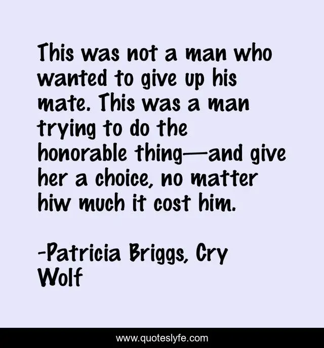 This page presents the quote "This was not a man who wanted to give up his mate. This was a man trying to do the honorable thing—and give her a choice, no matter hiw much it cost him.". Author of this quote is Patricia Briggs, Cry Wolf. This quote is about faith, love, charles-cornick, alpha-and-omega, choice, cry-wolf, security, anna-cornick, affection,.
