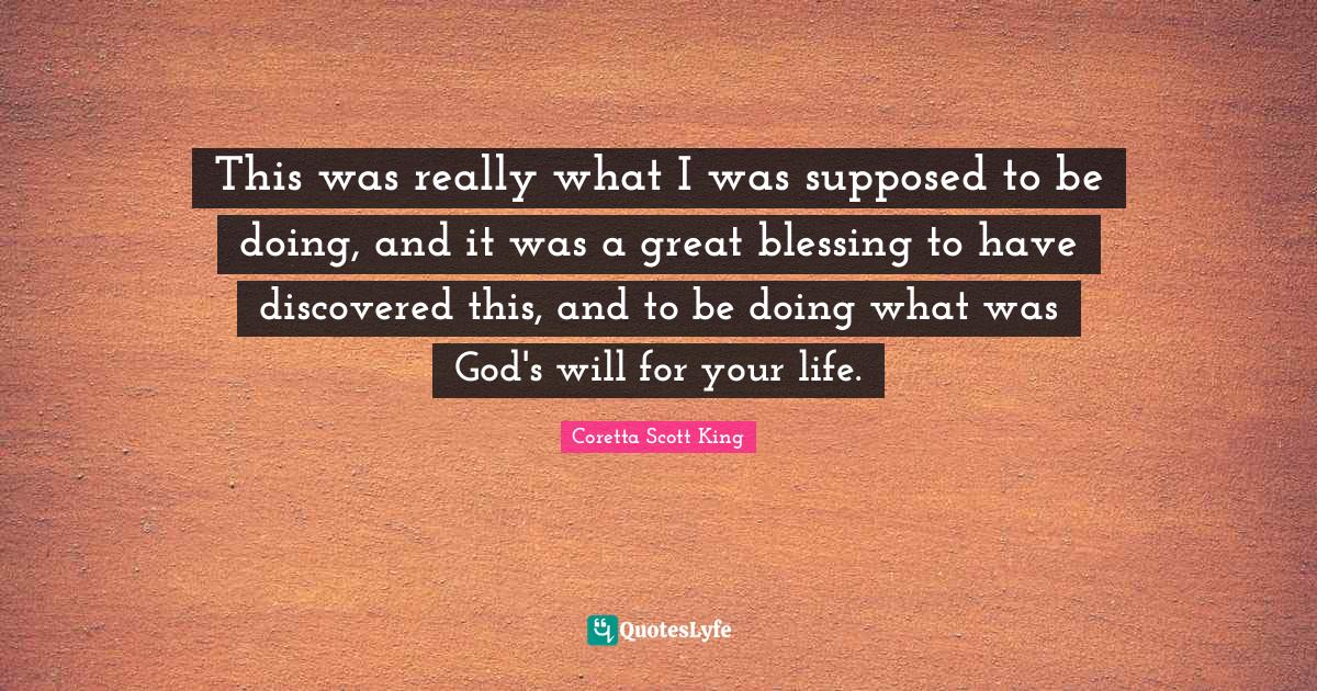 This page presents the quote "This was really what I was supposed to be doing, and it was a great blessing to have discovered this, and to be doing what was God's will for your life.". Author of this quote is Coretta Scott King. This quote is about god's will, blessing, supposed to be, life,.