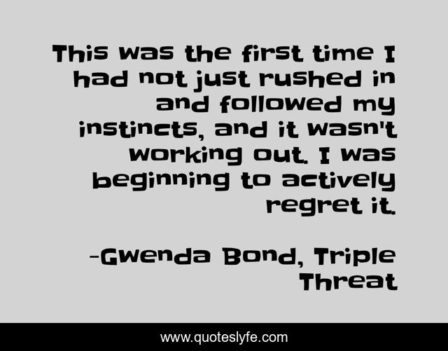 This page presents the quote "This was the first time I had not just rushed in and followed my instincts, and it wasn't working out. I was beginning to actively regret it.". Author of this quote is Gwenda Bond, Triple Threat. This quote is about lois-lane, regret, hard-work, first-time, gwenda-bond, journalism, triple-threat, uncertainty, instinct,.