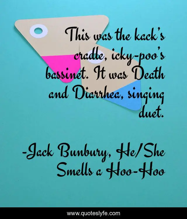 This page presents the quote "This was the kack’s cradle, icky-poo’s bassinet. It was Death and Diarrhea, singing duet.". Author of this quote is Jack Bunbury, He/She Smells a Hoo-Hoo. This quote is about gross, stink, humorous, odor, aroma, smell,.