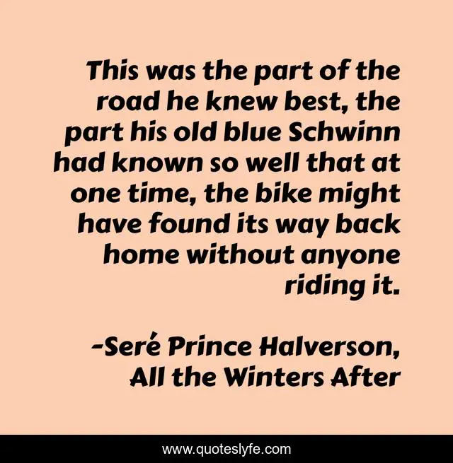 This page presents the quote "This was the part of the road he knew best, the part his old blue Schwinn had known so well that at one time, the bike might have found its way back home without anyone riding it.". Author of this quote is Seré Prince Halverson, All the Winters After. This quote is about home, biking, childhood, schwinn,.