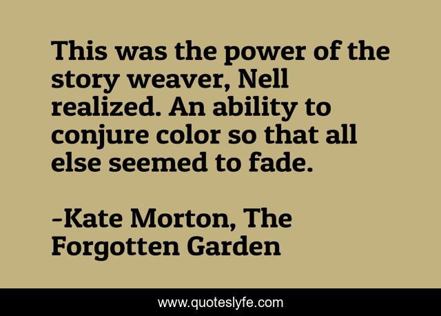 This page presents the quote "This was the power of the story weaver, Nell realized. An ability to conjure color so that all else seemed to fade.". Author of this quote is Kate Morton, The Forgotten Garden. This quote is about yarns, story, forgotten, tales, garden,.