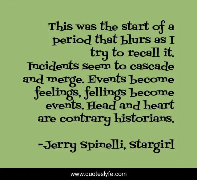 This page presents the quote "This was the start of a period that blurs as I try to recall it. Incidents seem to cascade and merge. Events become feelings, fellings become events. Head and heart are contrary historians.". Author of this quote is Jerry Spinelli, Stargirl. This quote is about heart, head,.