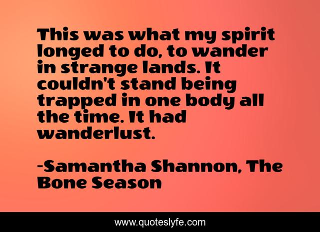 This page presents the quote "This was what my spirit longed to do, to wander in strange lands. It couldn't stand being trapped in one body all the time. It had wanderlust.". Author of this quote is Samantha Shannon, The Bone Season. This quote is about wanderlust, spirit,.