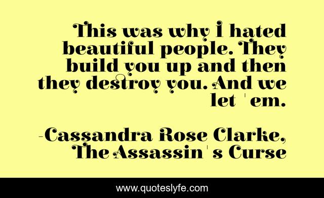 This page presents the quote "This was why I hated beautiful people. They build you up and then they destroy you. And we let 'em.". Author of this quote is Cassandra Rose Clarke, The Assassin's Curse. This quote is about beautiful, hate,.