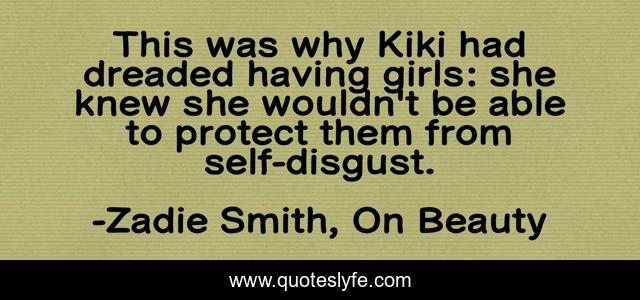 This page presents the quote "This was why Kiki had dreaded having girls: she knew she wouldn't be able to protect them from self-disgust.". Author of this quote is Zadie Smith, On Beauty. This quote is about girls, beauty, daughters,.