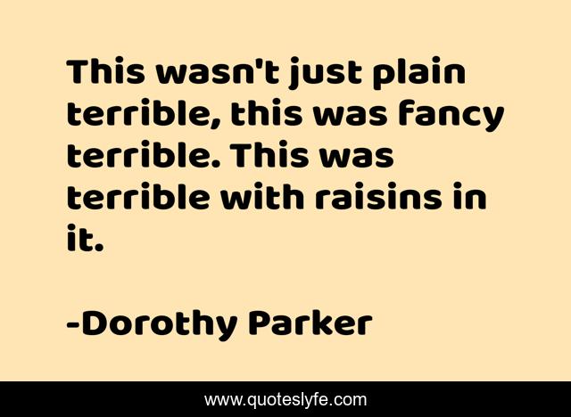 This page presents the quote "This wasn't just plain terrible, this was fancy terrible. This was terrible with raisins in it.". Author of this quote is Dorothy Parker. This quote is about humor, humour,.