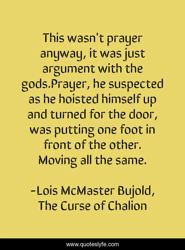 This page presents the quote "This wasn't prayer anyway, it was just argument with the gods.Prayer, he suspected as he hoisted himself up and turned for the door, was putting one foot in front of the other. Moving all the same.". Author of this quote is Lois McMaster Bujold, The Curse of Chalion. This quote is about moving-forward, prayer,.