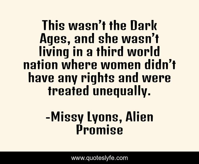 This page presents the quote "This wasn’t the Dark Ages, and she wasn’t living in a third world nation where women didn’t have any rights and were treated unequally.". Author of this quote is Missy Lyons, Alien Promise. This quote is about rights, womens-rights, nation, female, dark-ages, equal-treatment,.