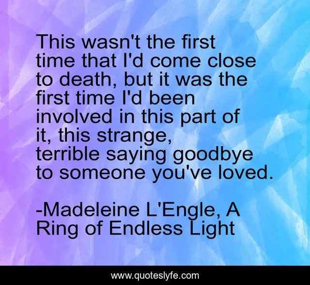 This page presents the quote "This wasn't the first time that I'd come close to death, but it was the first time I'd been involved in this part of it, this strange, terrible saying goodbye to someone you've loved.". Author of this quote is Madeleine L'Engle, A Ring of Endless Light. This quote is about loss, death, love, goodbye, affection,.