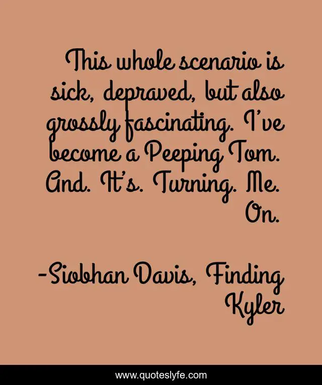 This page presents the quote "This whole scenario is sick, depraved, but also grossly fascinating. I’ve become a Peeping Tom. And. It’s. Turning. Me. On.". Author of this quote is Siobhan Davis, Finding Kyler. This quote is about angsty-romance, dysfunctional-relationships, new-adult-romance-and-suspense, contemporary-romance,.
