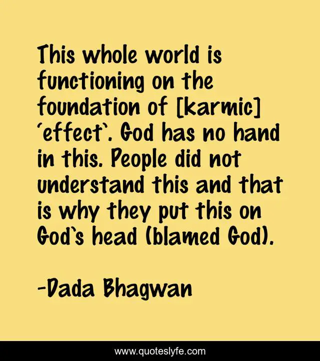This page presents the quote "This whole world is functioning on the foundation of [karmic] ‘effect’. God has no hand in this. People did not understand this and that is why they put this on God’s head (blamed God).". Author of this quote is Dada Bhagwan. This quote is about foundation, spiritual, god-s-head, god, carmic, world,.