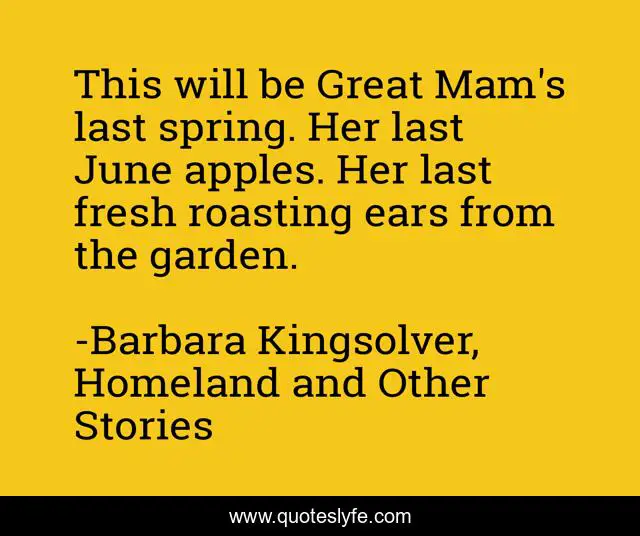 This page presents the quote "This will be Great Mam's last spring. Her last June apples. Her last fresh roasting ears from the garden.". Author of this quote is Barbara Kingsolver, Homeland and Other Stories. .