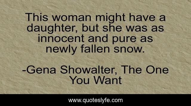 This page presents the quote "This woman might have a daughter, but she was as innocent and pure as newly fallen snow.". Author of this quote is Gena Showalter, The One You Want. This quote is about innocent, pure, innocence,.