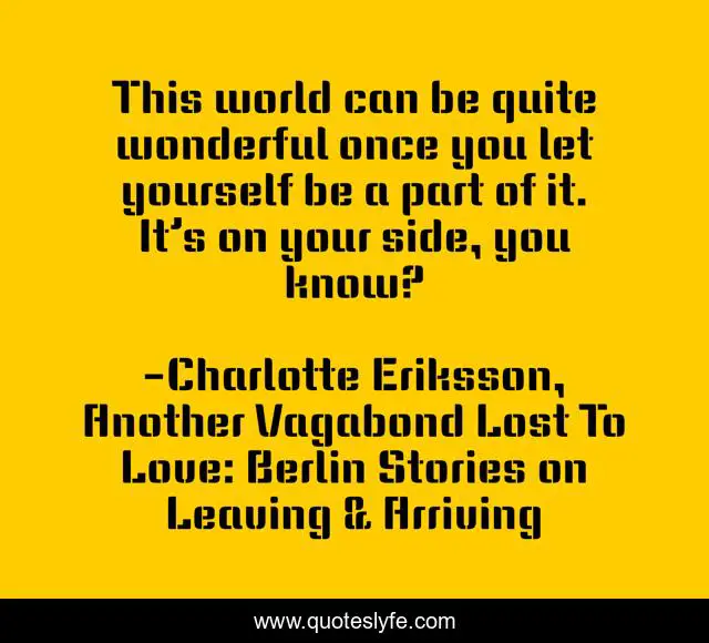This page presents the quote "This world can be quite wonderful once you let yourself be a part of it. It’s on your side, you know?". Author of this quote is Charlotte Eriksson, Another Vagabond Lost To Love: Berlin Stories on Leaving & Arriving. This quote is about life, writer, belief, songwriter, musician, singer, band, wonderful, world,.