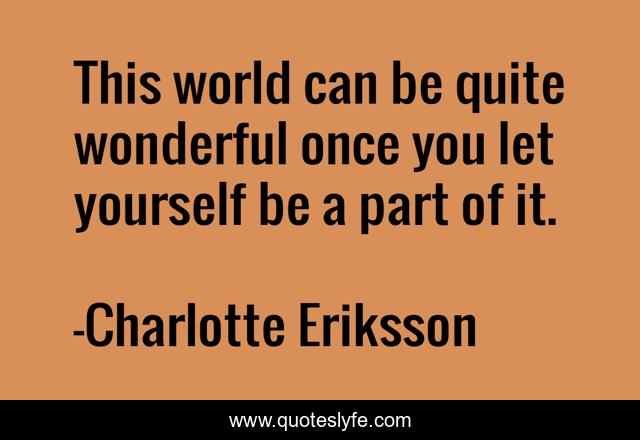 This page presents the quote "This world can be quite wonderful once you let yourself be a part of it.". Author of this quote is Charlotte Eriksson. This quote is about beautiful, living, life, the-world, the-glass-child, joy, charlotte-eriksson, free, writer,.