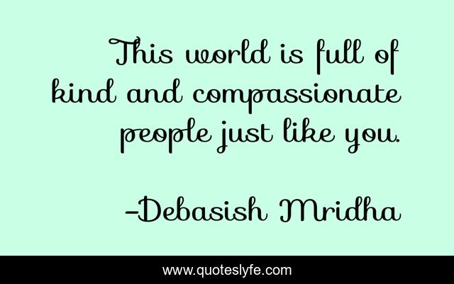 This page presents the quote "This world is full of kind and compassionate people just like you.". Author of this quote is Debasish Mridha. This quote is about kind, inspirational, kind-and-compassionate, philosophy, debasish-mridha, quotes, compassionate-people, kind-people, enthusiasm,.