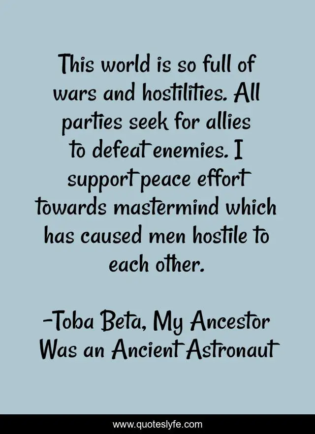 This page presents the quote "This world is so full of wars and hostilities. All parties seek for allies to defeat enemies. I support peace effort towards mastermind which has caused men hostile to each other.". Author of this quote is Toba Beta, My Ancestor Was an Ancient Astronaut. This quote is about life, hostility, peace, truth, mastermind, war,.