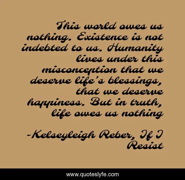 This page presents the quote "This world owes us nothing. Existence is not indebted to us. Humanity lives under this misconception that we deserve life’s blessings, that we deserve happiness. But in truth, life owes us nothing". Author of this quote is Kelseyleigh Reber, If I Resist. This quote is about life, deserving, indebtedness, universe, human, debts, humanity, life-s-blessings, mankind,.