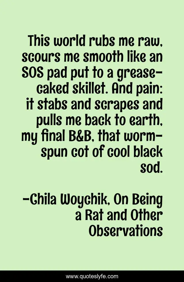 This page presents the quote "This world rubs me raw, scours me smooth like an SOS pad put to a grease-caked skillet. And pain: it stabs and scrapes and pulls me back to earth, my final B&B, that worm-spun cot of cool black sod.". Author of this quote is Chila Woychik, On Being a Rat and Other Observations. This quote is about death, pain, writing, rats, death-and-dying, grave,.