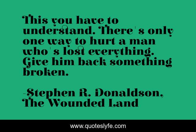 This page presents the quote "This you have to understand. There's only one way to hurt a man who's lost everything. Give him back something broken.". Author of this quote is Stephen R. Donaldson, The Wounded Land. This quote is about loss, pain, hurt, broken, suffering, leprosy,.