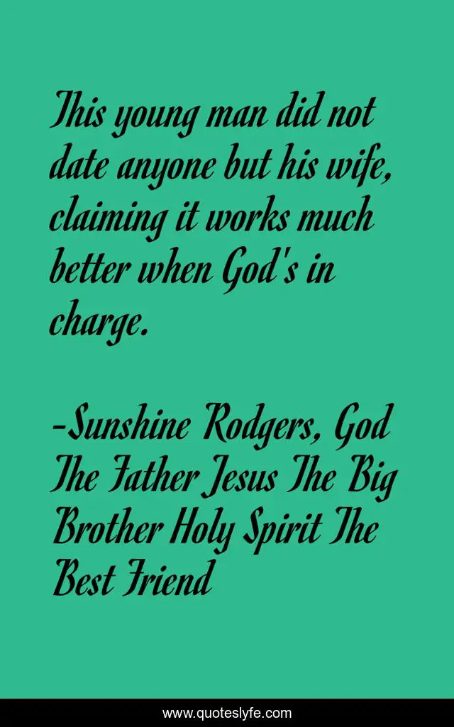 This page presents the quote "This young man did not date anyone but his wife, claiming it works much better when God's in charge.". Author of this quote is Sunshine Rodgers, God The Father Jesus The Big Brother Holy Spirit The Best Friend. This quote is about enthusiasm, christian, nonfiction, inspirational,.