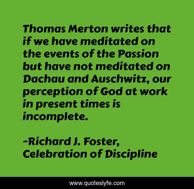 This page presents the quote "Thomas Merton writes that if we have meditated on the events of the Passion but have not meditated on Dachau and Auschwitz, our perception of God at work in present times is incomplete.". Author of this quote is Richard J. Foster, Celebration of Discipline. This quote is about discipleship, prayer, intercession, spiritual-warfare,.