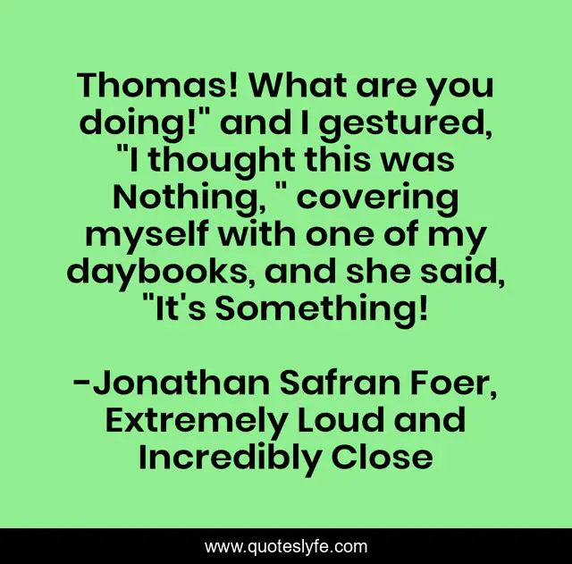 This page presents the quote "Thomas! What are you doing!" and I gestured, "I thought this was Nothing, " covering myself with one of my daybooks, and she said, "It's Something!". Author of this quote is Jonathan Safran Foer, Extremely Loud and Incredibly Close. This quote is about nothing, someting, undressing,.