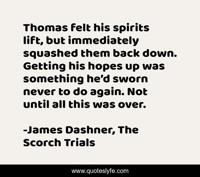 This page presents the quote "Thomas felt his spirits lift, but immediately squashed them back down. Getting his hopes up was something he’d sworn never to do again. Not until all this was over.". Author of this quote is James Dashner, The Scorch Trials. This quote is about the-maze-runner, thomas, expectations, hopeless, hope, the-scorch-trials,.