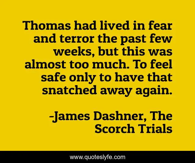 This page presents the quote "Thomas had lived in fear and terror the past few weeks, but this was almost too much. To feel safe only to have that snatched away again.". Author of this quote is James Dashner, The Scorch Trials. This quote is about horror, maze-runner, thomas, scorch-trials,.