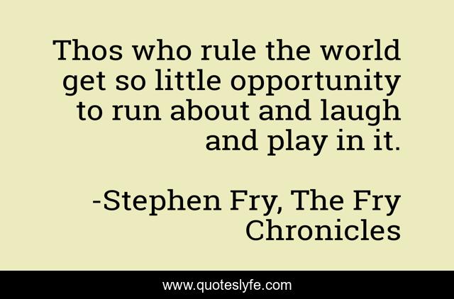 This page presents the quote "Thos who rule the world get so little opportunity to run about and laugh and play in it.". Author of this quote is Stephen Fry, The Fry Chronicles. This quote is about active, autobiography, fun, true, happiness,.