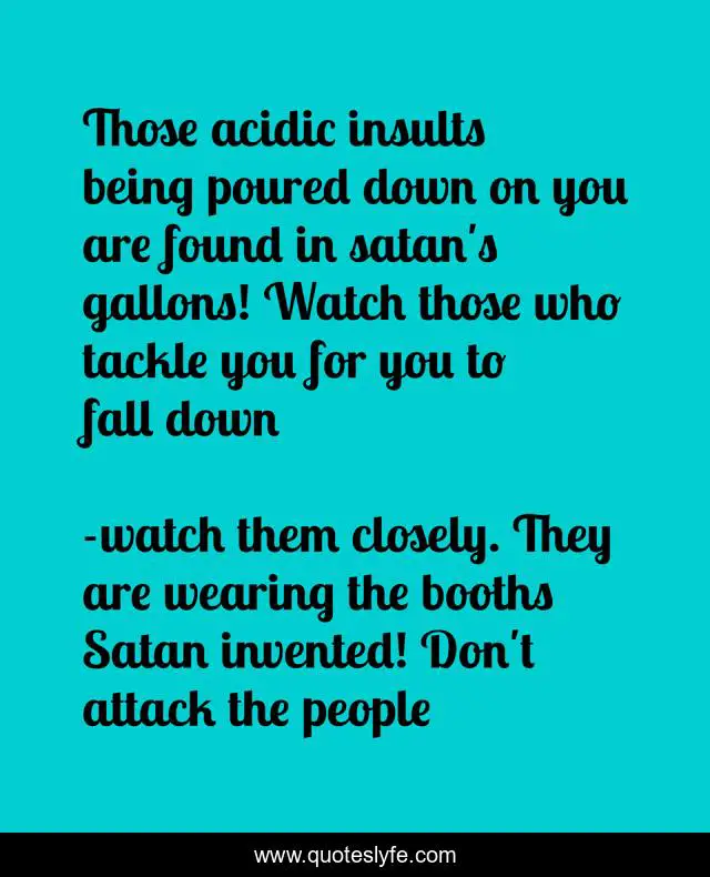 This page presents the quote "Those acidic insults being poured down on you are found in satan's gallons! Watch those who tackle you for you to fall down". Author of this quote is watch them closely. They are wearing the booths Satan invented! Don't attack the people. .