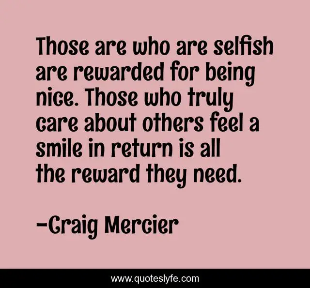 This page presents the quote "Those are who are selfish are rewarded for being nice. Those who truly care about others feel a smile in return is all the reward they need.". Author of this quote is Craig Mercier. This quote is about craigisms, advice, self-improvement, inspirational, selfishness, enthusiasm, reward,.